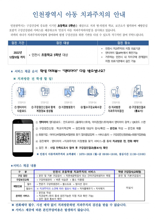 김석철 시 건강보건국장은 “치아는 한번 망가지면 재생이 불가하므로 올바른 구강관리를 통한 질병 예방이 무엇보다 중요하다”며 “비용 부담 없는 전문적인 구강관리서비스에 인천시 초등학교 5학년 학생들의 많은 참여를 부탁한다”고 말했다.