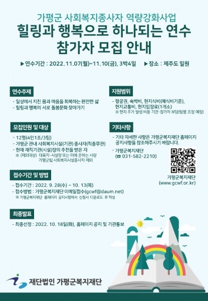 힐링과 행복으로 하나되는 연수는 가평군복지재단에서 진행하는 가평군 사회복지종사자 역량강화사업으로 지역 사회복지 실천 현장 종사자들의 업무소진을 예방하고 직무능력을 향상함으로써 시설의 대주민 서비스의 질 향상과 사회복지에 대한 인식을 제고하는데 중점을 두고 있다.
