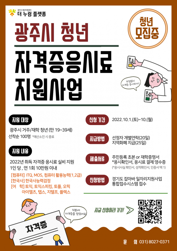 시 관계자는 “자격증 응시료 지원 사업을 통해 광주시 청년들이 구직 활동과 자기 개발을 함에 있어서 경제적인 부담과 환경적 제약에 구애받지 않고 미래를 준비하는데 도움이 됐으면 한다”고 말했다.