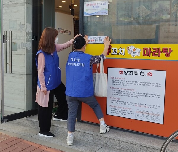 이번 활동은 마산동행정복지센터 인근 편의점, 식당 등에서 이루어졌으며 캠페인 활동을 통해 유해환경 개선 및 청소년 보호의식 확산 등 건전한 사회분위기 조성을 위해 실시됐다.