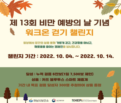 하남시보건소 관계자는 “가을은 여름보다 햇볕의 양이 줄어 식욕 억제 기능을 하는 세로토닌 호르몬의 분비가 감소 돼 살이 찌기 쉬운 계절이다”며 “꾸준한 운동을 통해 적정한 체중 관리가 중요한 만큼, 일상생활 속 가장 실천하기 쉬운 걷기 운동을 통해 올가을을 더욱 건강하고 활기차게 보내시기 바란다”고 말했다.