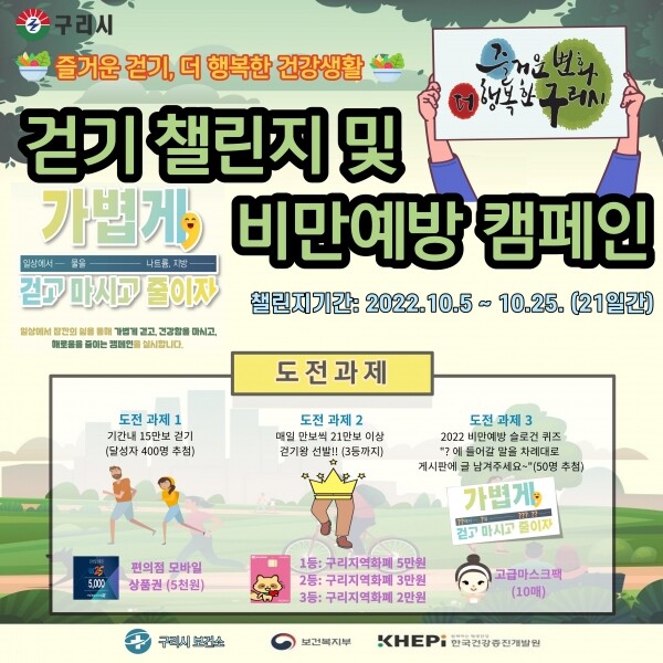 구리시는 캠페인 활동으로 오는 10월 5일부터 25일까지 21일간 모바일 앱인 워크온을 이용한 구리시 공식 걷기 커뮤니티인 “즐거운 걷기, 더 행복한 건강생활”을 이용해 ‘기간내 15만보 걷기 챌린지’를 운영하며 동시에 매일 만보씩 21만보이상 달성한 ‘구리시민 걷기왕 선발’과 ‘비만예방 슬로건 퀴즈’를 통해 정답자에게 푸짐한 상품을 지급할 예정이다.