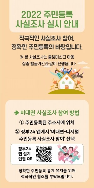 유태일 도 자치행정국장은 “주민등록 사실조사는 도정 수립의 밑바탕이 되는 주민등록 통계를 정확하게 해 경기도민의 복리증진에 기여하고자 하는 조사인 만큼 조사원이 방문할 때 주민들의 적극적인 협조를 부탁드린다”고 말했다.