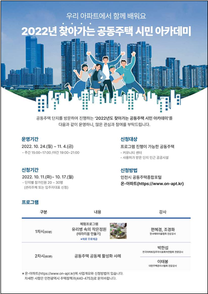 이번 아카데미에 관심 있는 단지는 10월 11일 ~ 10월 17일 기간에 인천시에서 운영하는 공동주택종합포털 온-아파트에서 신청하면 된다.