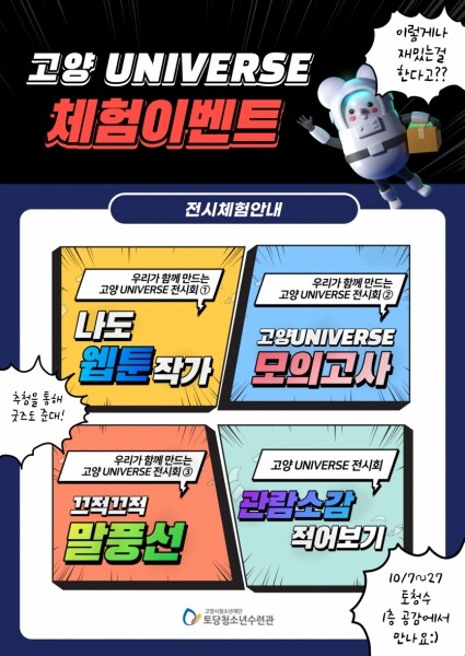 이번 전시회는 작품 전시, 고양 UNIVERSE 소개, 나도 웹툰작가, 고양 UNIVERSE 모의고사, 끄적끄적 말풍선, 관람소감 적기로 다양하게 구성됐다.