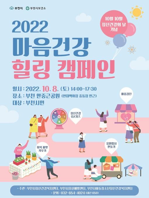 김인재 부천시보건소장은 “2022 마음건강 힐링 캠페인은 정신건강에 대한 지역주민의 인식개선과 정신건강의 중요성 환기를 위해 마련한 축제로 시민들의 많은 관심과 참여를 바란다”고 전했다.