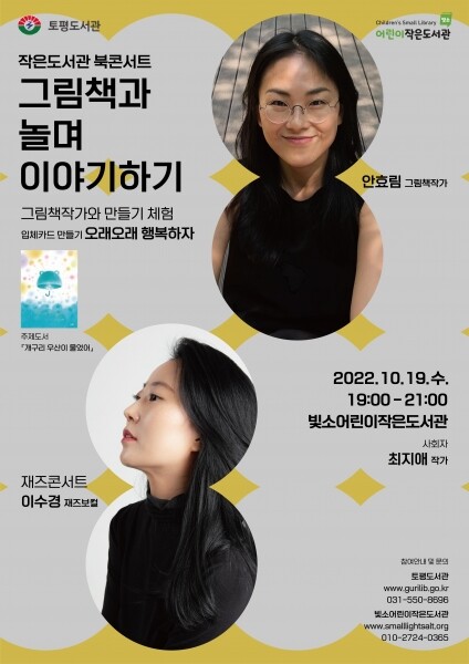 이번 북콘서트에서는 아이들이 좋아하는 동요를 재즈곡으로 편곡해 세련되면서 감수성 짙은 곡으로 재탄생, 피아노와 함께 들려주는 가을밤 재즈공연을 시작으로 안효림 동화작가의 ‘개구리 우산이 울었어’도서를 가지고 이야기를 나누며 만들기 체험을 진행해 온 가족이 함께 즐길 수 있는 행사를 운영할 계획이라고 전했다.