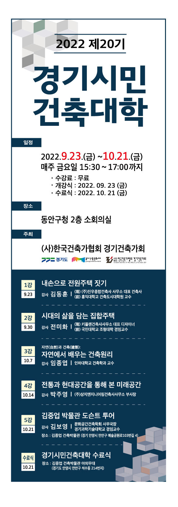 안양시는 오는 21일부터 23일까지 경기도와 함께 ‘2022 경기건축문화제’를 개최할 예정이다.
