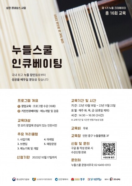 이번 프로그램은 면 요리 창업에 관심이 있는 인천시민을 대상으로 진행되며 인천 중구에 위치한 누들플랫폼 3층에서 맞춤형 창업 교육과 키친 인큐베이팅을 통해 밀착형 창업교육 운영으로 수강생들이 효과적인 성장을 지원한다.