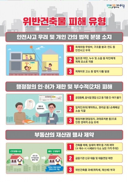 한편 서구는 지난해 위반건축물 예방사례집 발간에 이어 올해 안내문을 제작해 배포하는 등 위반건축물 발생을 사전에 방지하기 위해 선제적 노력을 기울이고 있다.