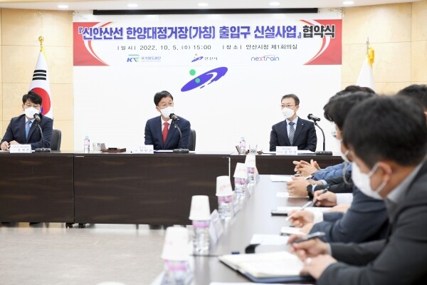 6일 시에 따르면 안산시는 지난 5일 안산시청에서 국가철도공단 및 신안산선 사업시행자인 넥스트레인㈜과 ‘신안산선 한양대정거장 출입구 신설사업’을 위한 협약식을 개최했다.