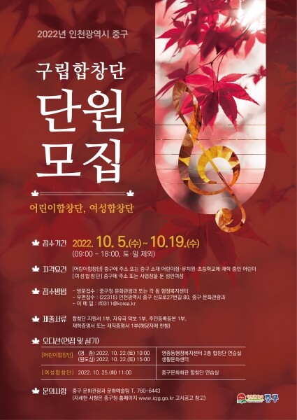 합창단 지원서는 중구청 누리집 고시공고 게시판에서 다운로드가 가능하다.