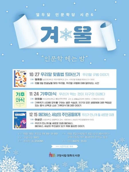 10월에는 정희창 성균관대학교 국어국문학과 교수가 ‘우리말 맞춤법 띄어쓰기’라는 제목으로 겨울편의 첫 강연을 시작한다.