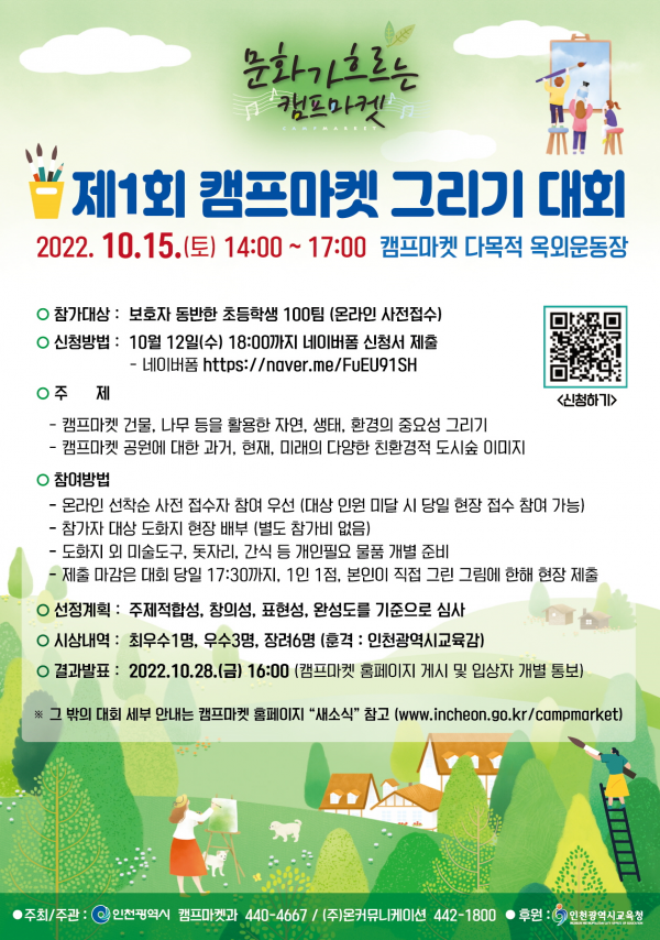 보호자를 동반한 초등학생 100팀이 참여하는 이번 ‘캠프마켓 그리기 대회’는 캠프마켓 홈페이지를 통해 오는 10월 12일까지 온라인 사전 참여 신청을 받고 있으며 최우수 1명, 우수 3명, 장려6명에 대해 인천광역시교육감상이 시상된다.