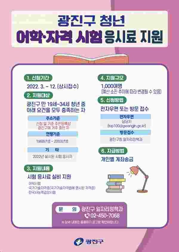 지원 대상은 만 19세 이상 34세 이하 청년 1천 명으로 신청일 기준 주민등록상 광진구에 거주 중인 자 2022년 시행된 시험 응시자 광진구 일자리센터에 구직 등록을 신청한 자이다.