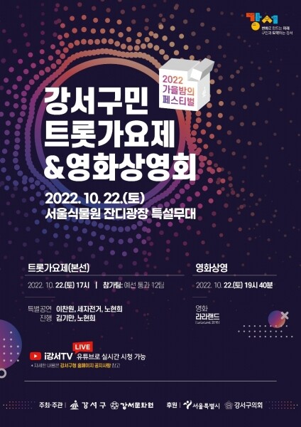트롯가요제는 문화와 예술이 넘치는 강서구를 만들어 지역경제를 살리고 구민의 일상회복을 지원하기 위해 마련된 행사로 회를 거듭할수록 인기를 끌고 있는 ‘마곡 문화의 거리 버스킹’에 이어 김 구청장이 기획한 두 번째 문화행사 프로젝트다.