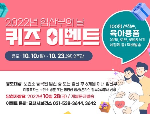 임산부의 날을 알리고 생활 속 임산부 배려 문화 확산과 사회적 관심 유도를 위해 마련된 이번 퀴즈이벤트는 오는 10일부터 23일까지 포천시청 홈페이지를 통해 참여할 수 있다.