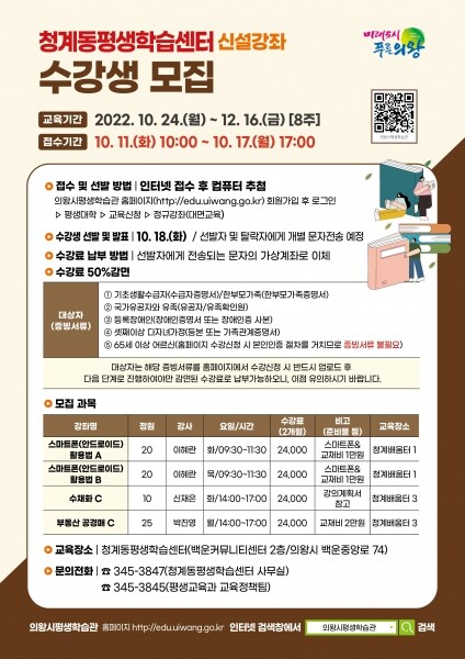 모집과목은 스마트폰 활용법, 수채화, 부동산 공경매 등 4개 강좌 75명으로 10월 24일부터 12월 16일까지 의왕시평생학습센터에서 교육받을 수 있다.