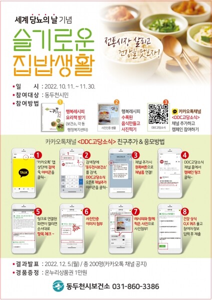캠페인에 참여하고자 하는 시민은 보건소 또는 각 동 행정복지센터에서 행복레시피를 수령한 뒤 수록된 음식을 만들어 먹는 사진과 O,X 건강퀴즈를 카카오톡채널 ‘DDC고당소식’을 통해 인증하면 된다.