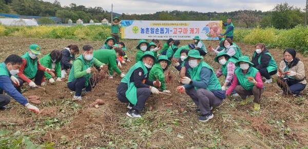 이날 일손돕기에는 임원 및 새마을지도자 30명이 참가해 1천여평 밭에서 고구마 넝쿨 제거와 고구매 캐기 등을 거들었다.