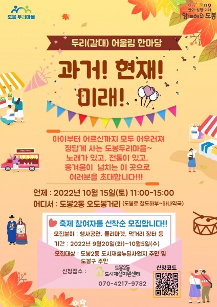 오언석 도봉구청장은 “지역 주민 화합의 장을 마련해주신 도봉2동 두리마을 주민협의체 여러분께 감사드린다 많은 분들께서 즐거운 축제의 장에 오셔서 함께해주시길 부탁드린다”고 말했다.