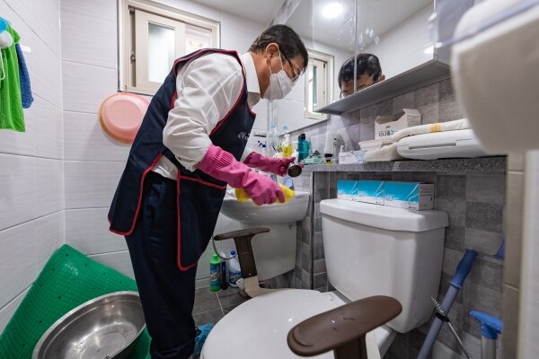 76세의 어르신이 거동 불편으로 청소가 여의치 않자, 김 구청장은 망설임 없이 화장실 청소에 바짓단을 걷고 나섰다.