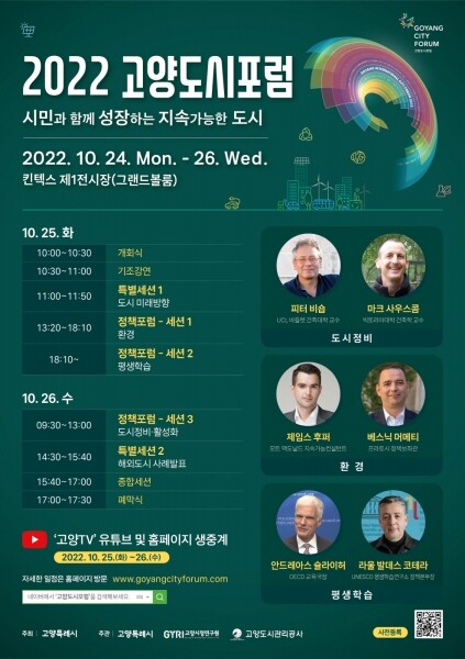 2022고양도시포럼에 참석하는 연사들은 UCL Battlet school 건축학 교수 피터 비숍 뉴질랜드 빅토리아 대학 건축학 교수 마크 사우스콤 OECD교육국장 안드레아스 슐라이허 지구환경과학 박사이자 방송인 제임스 후퍼 등이다.