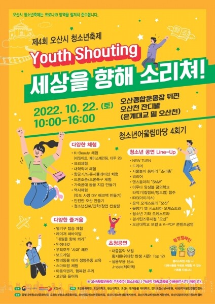 오산시와 여성가족부가 주최한 이번 축제는 지속되는 코로나19로 인해 여가와 문화생활을 즐기지 못했던 청소년들에게 다양한 체험 거리 및 즐거운 추억을 제공하기 위해 마련됐으며 오산시 청소년이면 누구나 참여 가능하다.
