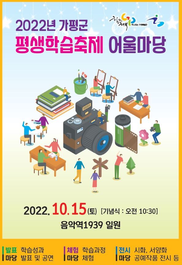 “학습으로 하나되는 어울마당”의 주제로 평생학습 마을 및 동아리와 평생학습 기관과 단체 52개 팀이 참여해 그간 각 분야에서 열심히 배우고 익힌 평생학습 활동사항을 군민과 함께 공유하고 즐길 수 있는 기회의 장을 마련코자 실시하게 됐다.