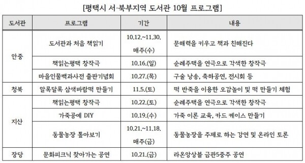 아울러 청북도서관에서는 ‘알록달록 삼색 바람떡 만들기’ 가 진행되며 지산초록도서관은 ‘가죽공예 DIY’, 조지 오웰의 동물농장 영서를 활용한 ‘동물농장 톺아보기’를 비롯해, 장당도서관 ‘문화피크닉 찾아가는 공연-금관5중주’ 공연 등 시월에 도서관에서 다양한 선택지를 즐길 수 있다.