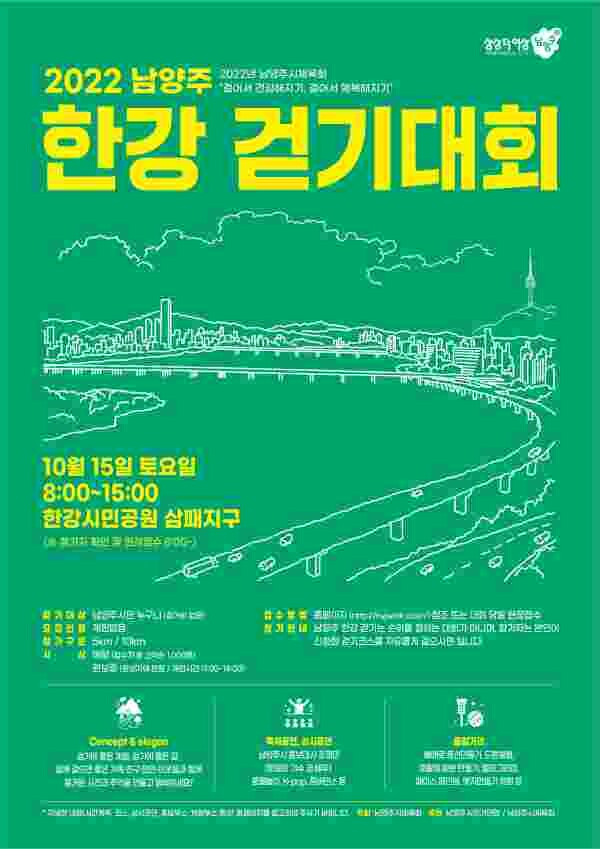 ‘2022 남양주 한강 걷기 대회’는 지난 9월 29일부터 10월 12일까지 홈페이지에서 사전 접수가 가능하며 사전 접수 기간 이후에는 행사 당일 오전 8시부터 10시까지 현장 접수가 진행된다.