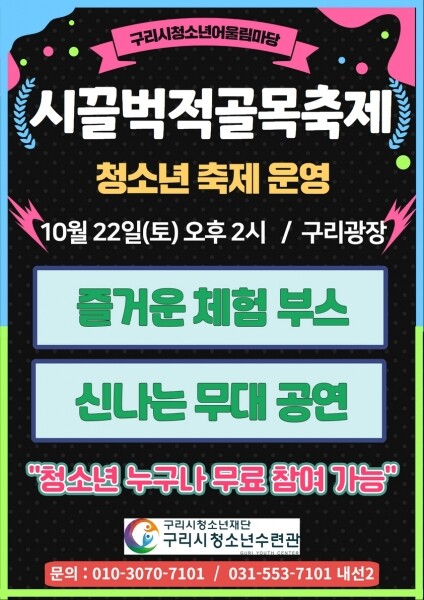 시끌벅적골목축제는 구리시에서 가장 큰 청소년축제로 청소년동아리, 학교, 청소년 관련기관 등에서 다양한 체험부스를 운영하고 노래, 댄스, 밴드 등 분야별 청소년동아리 공연무대도 함께 진행된다.