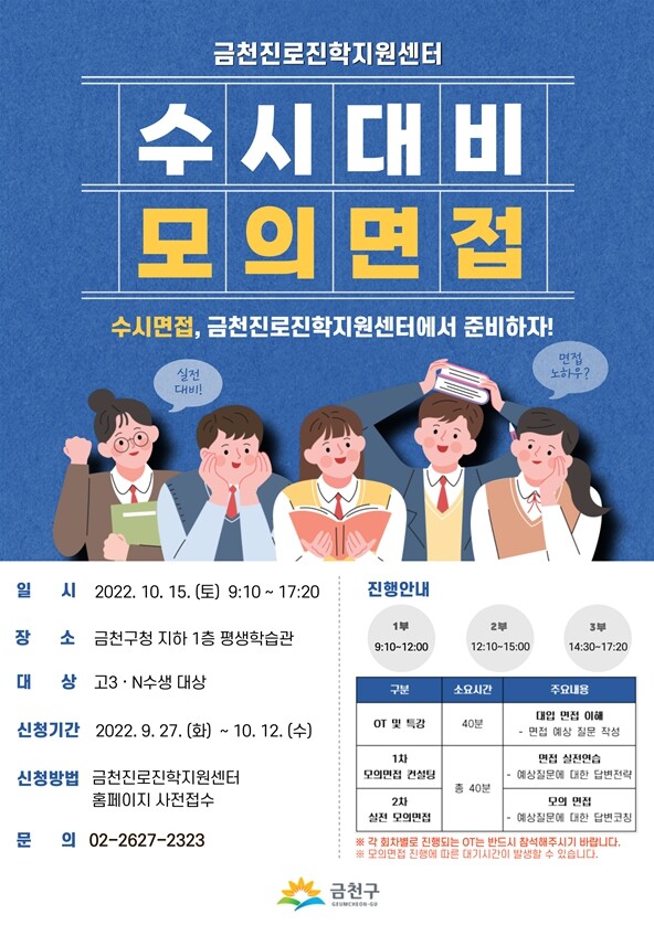 유성훈 금천구청장은 “2023학년도 수시모집 면접고사를 준비하는 수험생들이 개별 맞춤형 면접 기회를 통해 역량을 키울 수 있길 바란다”며 “앞으로도 자녀들의 진로·진학에 대한 고민을 덜어줄 수 있도록 다양한 교육과정을 운영하겠다”고 말했다.