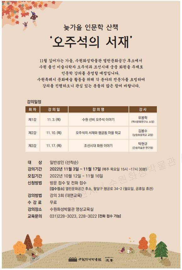 열린문화공간 후소는 11월 3일 10일 17일 3회에 걸쳐 오후 3시부터 5시 30분까지 수원화성박물관 영상교육실에서 ‘늦가을 인문학 산책-오주석의 서재’를 주제로 강의를 진행한다.