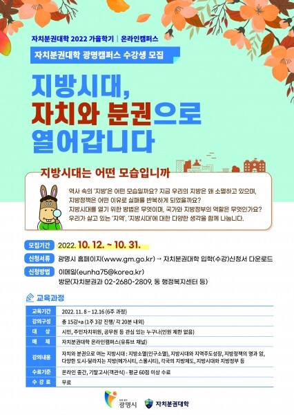 올해 자치분권대학에서는 2022년 새로운 지방자치법 시행과 함께 새정부와 민선 8기 지방정부 출범에 맞춰 전국 공직자를 대상으로 ‘새로운 지방자치법 바로알기’ 교육을 운영하고 있으며 광명시 공직자 687명이 수강하고 있다.