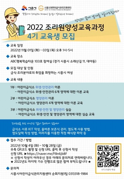 조리원 양성교육 과정은 시흥시 위생과와 시흥여성인력개발센터와 협력해 관내 어린이급식소의 조리 및 급식 분야로 취업을 희망하는 여성과 어린이급식소에서 필요한 이론 및 실무 능력의 향상을 희망하는 여성 등을 대상으로 어린이 급식소 위생·안전 및 영양관리 항목에 대한 이론·실습 교육을 진행하는 프로그램이다.