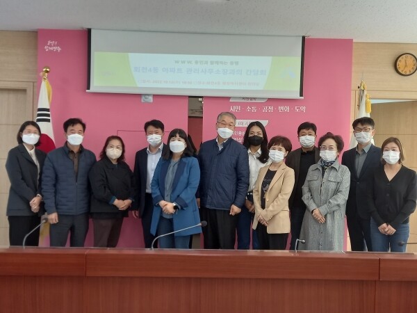 간담회에 참석한 관리사무소장님들은 “관리비 장기 체납 등 어려운 상황에 있는 입주민에게 도움이 될 만한 정보들을 많이 알게 됐고 회천4동에서 추진하고 있는 다양한 사업들을 활용해 주민이 더 살기 좋은 단지가 될 수 있도록 노력하겠다”고 말했다.