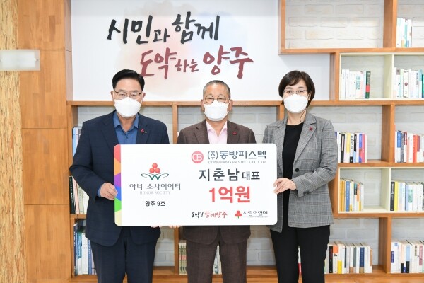양주시는 지춘남 ㈜동방파스텍 대표가‘양주시 아너소사이어티 9호 회원’과 ‘양주시 나눔명문기업 1호’에 동시 가입했다고 13일 밝혔다.