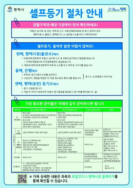 이재원 세정과장은 “시민들의 일상 속 어려움을 함께 풀어가는 맞춤형 행정을 위해 항상 고민하겠다”며 “부동산 셀프 등기와 관련해 궁금한 사항이 있는 경우 언제든 평택시의 도움을 받으시기 바란다”고 말했다.