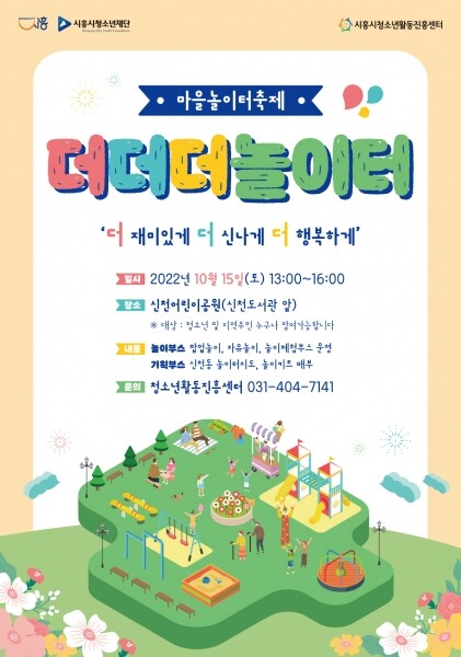 마을놀이터축제 ‘더더더 놀이터’는 ‘더 재미있게 더 신나게 더 행복하게’라는 주제로 놀이의 즐거움과 놀이문화 확산을 위해 청소년과 성인기획단이 함께 기획해 운영한다.
