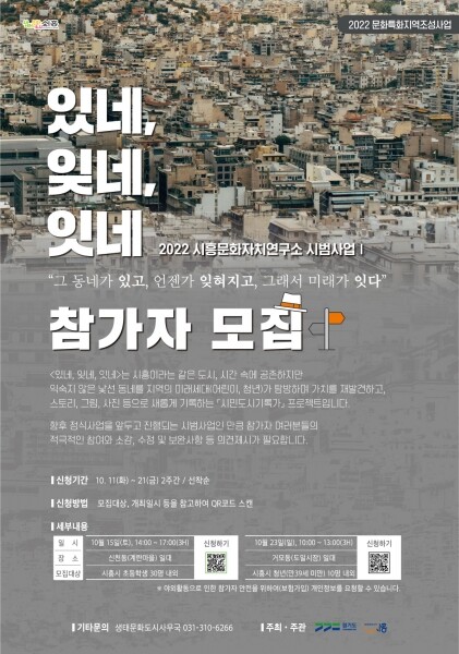 한편 2022 시흥문화자치연구소 시범사업 ‘있네, 잊네, 잇네’의 참가 신청은 오는 21일까지 안내문의 QR코드로 가능하며 관내 초등학생 30명 내외, 시흥시 거주 청년 10명을 대상으로 한다.