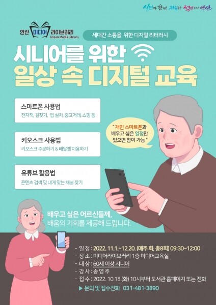 수업은 11월 1일부터 12월 20일까지 매주 화요일 오전 9시 30분부터 12시까지 2시간 30분간 총 8회에 걸쳐 진행되며 교육 신청은 이달 18일 오전 10시부터 안산미디어라이브러리 누리집 문화강좌나 전화로 접수 가능하다.