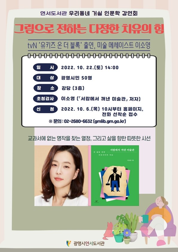 이번 강연회에서는 ‘서랍에서 꺼낸 미술관’의 저자이자 조이 뮤지엄 대표, tvN ‘유키즈 온 더 블록’에 출연한 미술 에세이스트 이소영 작가를 초청해 정규교육을 받지 않은 화가의 작품인 ‘아웃사이더 아트’를 찾아다닌 마음의 여정을 시민들과 함께 나누며 삶을 향한 따뜻한 시선을 느껴보는 시간을 가진다.