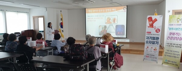 이번 교육은 광주시 건강증진센터의 지원을 받아 소속 간호사가 강사로 나서 교육을 진행했으며 혈압·당뇨 자가측정 실습 고혈압·당뇨병 위험요인 고혈압·당뇨병 예방을 위한 관리 방법 등을 통해 어르신들의 만성질환 건강관리 역량을 강화하는 데 초점을 맞춰 진행했다.