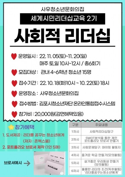 김포시청소년재단 조성훈 수련관장은 “리더십 교육을 통해 청소년이 사회를 들여다보고 사회 문제를 적극적으로 탐구함으로써 문제를 해결할 수 있는 리더로서의 역량을 키우길 바란다”고 전했다.