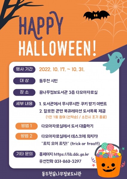 [뉴스써치] 동두천시 평생교육원 꿈나무정보서관은 10월 17일부터 31일까지 외국 명절인 할로윈을 맞아 이벤트를 진행한다고 밝혔다.