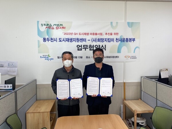 업무협약식에는 조민 동두천시 도시재생지원센터장과 김영호 희망지킴이 천사운동본부장 등이 참석했다.