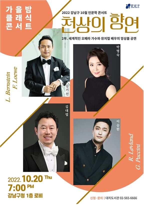 조성명 강남구청장은 “코로나 장기화로 문화예술 공연을 접할 기회가 적어 아쉬웠을 강남구민을 위해 찾아가는 클래식 콘서트를 준비했다”며 “깊어가는 가을밤, 아름다운 선율을 만끽하며 문화도시 강남의 품격을 느낄 수 있는 시간이 되길 바란다”고 말했다.