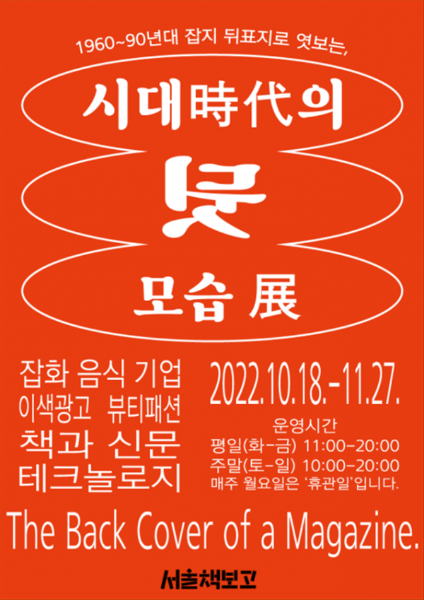‘과학기술, 잡화, 미용 및 패션, 기업 이미지, 책과 신문, 음식, 이색 광고’라는 일곱 가지 주제로 서울책보고가 보유하고 있는 1960~90년대 문예지·시사 주간지·여성 월간지·사보 등 100여 권을 전시 및 판매한다.