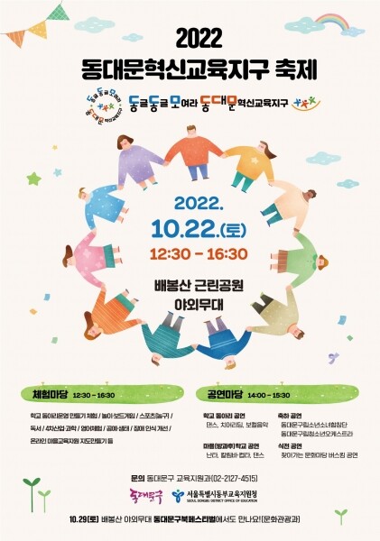 ‘동글동글 모여라, 동대문혁신교육지구 축제’라는 주제로 열리는 이번 행사는 다양한 지역 주민들이 모여 혁신교육사업의 성과를 공유하고 공감대를 형성하는 소통과 화합의 장이다.